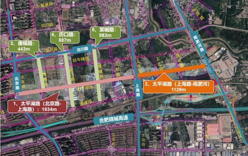三條道路呈平行之勢,依次排開,與本次建設(shè)的太平湖路交錯連通,奠定北京路、龍川路、上海路、繞城高速合圍區(qū)域內(nèi)骨干路網(wǎng)架構(gòu),既可為龍川路、上海路等城市主干道提供合理的交通分流,也可為淝河科創(chuàng)中心、龍川路南生態(tài)宜居區(qū)域提供堅實的配套服務(wù)。
